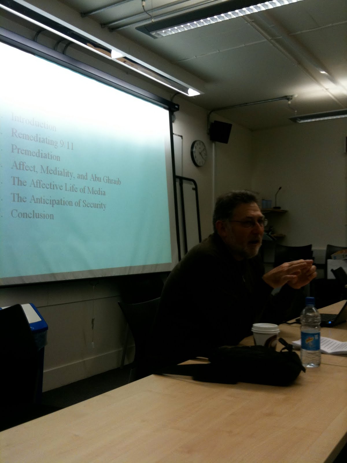 Talking of anticipation — It’s always wonderful to meet in person people whose texts you have read for years — and admired. Richard Grusin’s visit at Anglia Ruskin finally took place, and was as every bit interesting as I was expecting it to be. His and Jay David Bolter’s Remediation-book and thesis had a huge impact in combining my new media interests with my background and training in history, and now his new stuff on premediation promises to combine such theoretisations of temporality with the very current debates concerning affect, security and media culture.