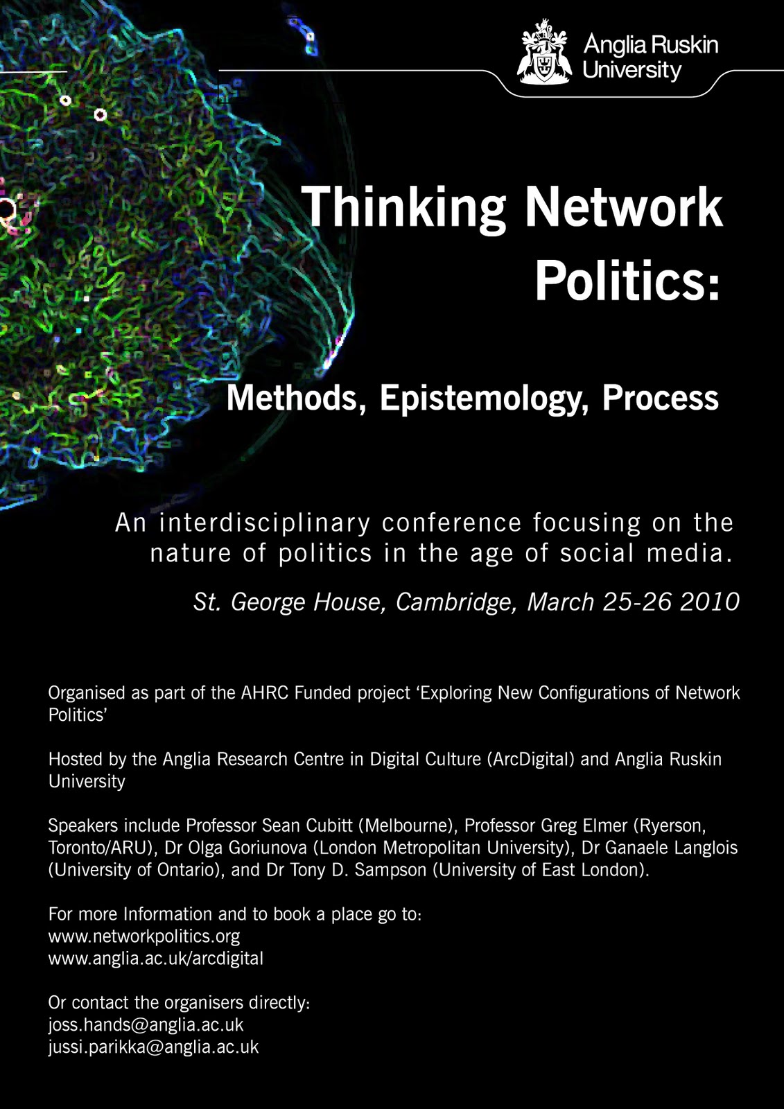 >Here is the poster for our forthcoming Network-politics event, full title: Thinking Network Politics: Methods, Epistemology, Process. Its the first in series for the AHRC funded project, followed up by next one in Toronto around end of October and the final one in Cambridge, next year.