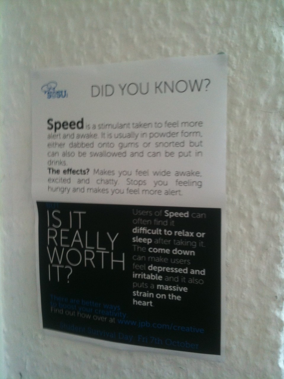 A poster I spotted on the dangers of speed — although, Ali G might have asked after reading half-way through: “but where are the downsides?”.